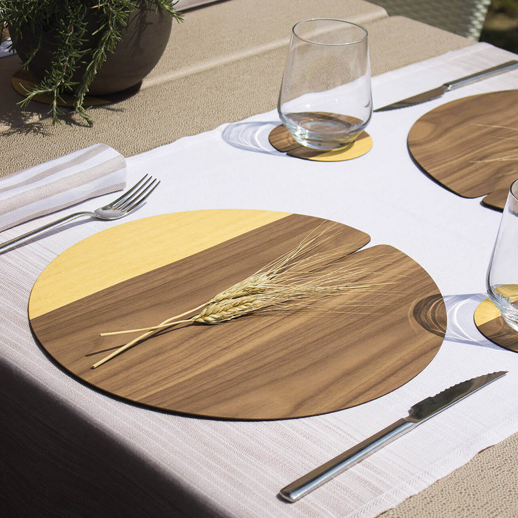 Realizzate in vero legno flessibile e tessuto tecnico, piacevoli al tatto e facili da maneggiare per apparecchiare e sparecchiare la tavola.