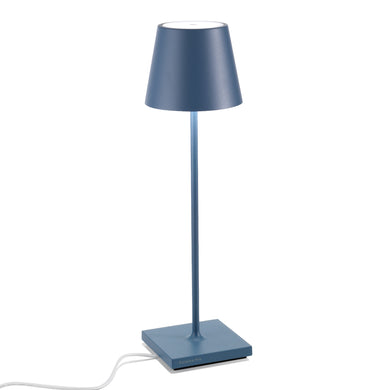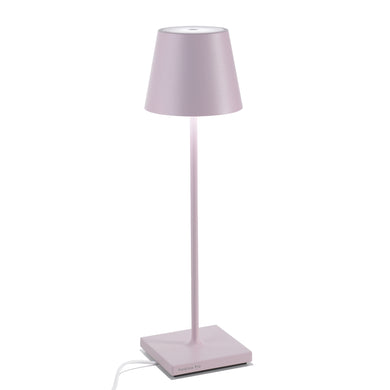 Lampada ricaricabile da tavolo dotata di base di ricarica a contatto, con corpo in pressofusione di alluminio verniciato e fonte luminosa a LED.