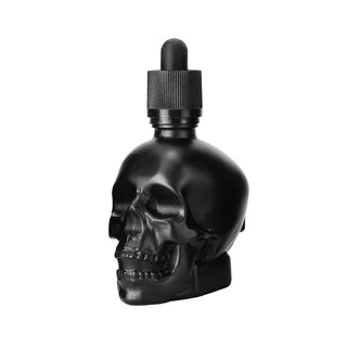Bottiglia per angostura a forma di teschio di colore nero in vetro.