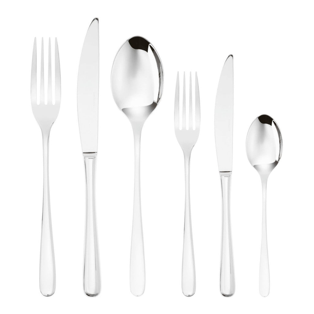 - Servizio tavola per 6 persone. Include 6 forchette tavola, 6 cucchiai tavola, 6 coltelli tavola, 6 cucchiaini tè, 6 forchettine dessert, e 6 coltellini dessert.