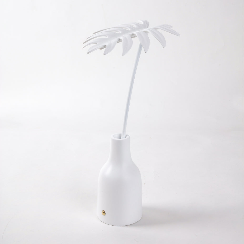 Queste foglie, dettagliate come sculture classiche, hanno un equilibrio formale con il loro vasetto e sono un elegante alternativa nel panorama delle lampade da tavolo.