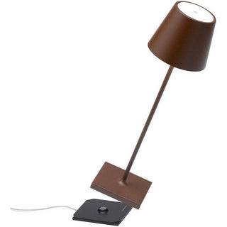 Lampada ricaricabile da tavolo dotata di base di ricarica a contatto, con corpo in pressofusione di alluminio verniciato e fonte luminosa a LED.